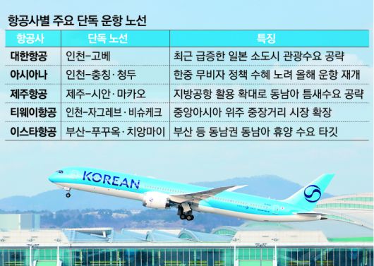 먼저 대한항공은 올해 4월부터 국적 항공사 최초로 인천-고베 노선에 일 2회 신규 취항했다. 최근 수요가 급증한 일본 소도시 노선 경쟁력을 강화하기 위한 움직임이다.