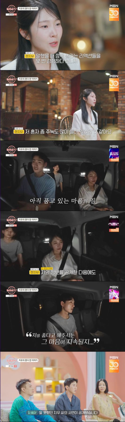 방송 말미, 지우는 "저는 두 번의 이혼을 겪었다"고 조심스럽게 고백했다. 지우는 자신의 이혼 사실을 들은 사람들이 놀라는 경우가 많았다고 언급하며, "이후 사람을 만나는 데 주눅이 많이 들었던 것 같다"고 솔직한 심경을 밝혔다.