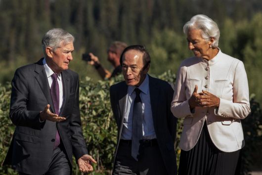 제롬 파월 미국 연방준비제도(Fed·연준) 의장(왼쪽)이 22일(현지 시간) 미국 와이오밍주 모런에서 열린 잭슨홀 회의 휴식 시간에 우에다 가즈오 일본은행 총재(가운데), 크리스틴 라가르드 유럽중앙은행(ECB) 총재와 대화를 나누고 있다. 파월 의장은 이날 미국 기준금리를 인하할 가능성을 시사했다. 모런=AP 뉴시스 |