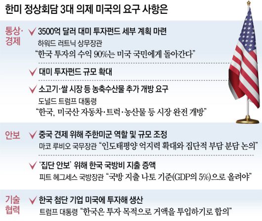 미국은 또 3500억 달러의 대미 투자액 자체를 늘리는 방안도 요구한 것으로 알려졌다. 이와 함께 미국은 우리 정부가 시장 개방 대상이 아니라고 선을 그었던 쌀, 소고기 등 농축산물 추가 개방 압박도 정상회담을 앞두고 본격화한 것으로 전해졌다.