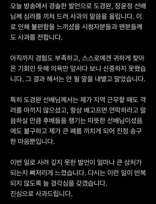 김진웅은 "특히 도경완 선배님께서는 제가 지역 근무할 때도 격려를 아끼지 않으셨고, 항상 배고프면 연락하라고 말씀하실 만큼 후배들을 챙기는 따뜻한 선배님이셨음에도 불구하고 제가 큰 폐를 끼치게 되어 진정 송구한 마음뿐"이라며, "이번 일로 사려 깊지 못한 발언이 얼마나 큰 상처가 되는지 뼈저리게 느꼈습니다. 다시는 이런 일이 반복되지 않도록 늘 경각심을 갖겠습니다. 진심으로 사과드립니다"라고 거듭 사과했다.