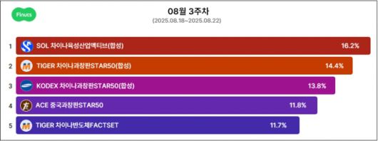 8월 셋째 주(18~22일) 상장지수펀드(ETF) 수익률은 중국 반도체에 대한 공격적인 투자심리가 반영됐다. 중국 인공지능(AI) 스타트업 '딥시크'가 국산 칩지원을 강화한 업그레이드 모델(v3.1)을 공개하면서 중국 반도체주는 활황이었다. 여기에 엔비디아 H20(중국 전용 AI칩) 생산 작업 일시 중단 보도가 겹치면서 중국 AI와 반도체 종목들이 수혜를 입었다.