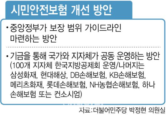 현재 국회는 시민안전보험 보장 격차를 줄이기 위해 중앙정부가 가이드라인을 마련하는 방안과 기금을 통해 국가와 지자체가 공동으로 운영하는 방안을 검토 중이다. 현재 시민안전보험에 가입한 233개 지자체 중 100개는 한국지방공제회가 운영하며 나머지 지자체는 삼성화재, 현대해상, DB손해보험, KB손해보험, 메리츠화재, 롯데손해보험, NH농협손해보험, 하나손해보험 또는 이들 보험사가 운영하는 컨소시엄에 맡기고 있다.