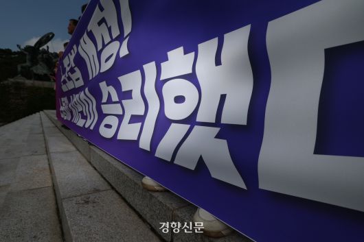 노란봉투법’(노동조합법 2·3조 개정안)이 국회 본회의를 통과한 24일 노동계가 국회 본청 앞 계단에서 환영 기자회견을 열고 있다. 정효진 기자 |