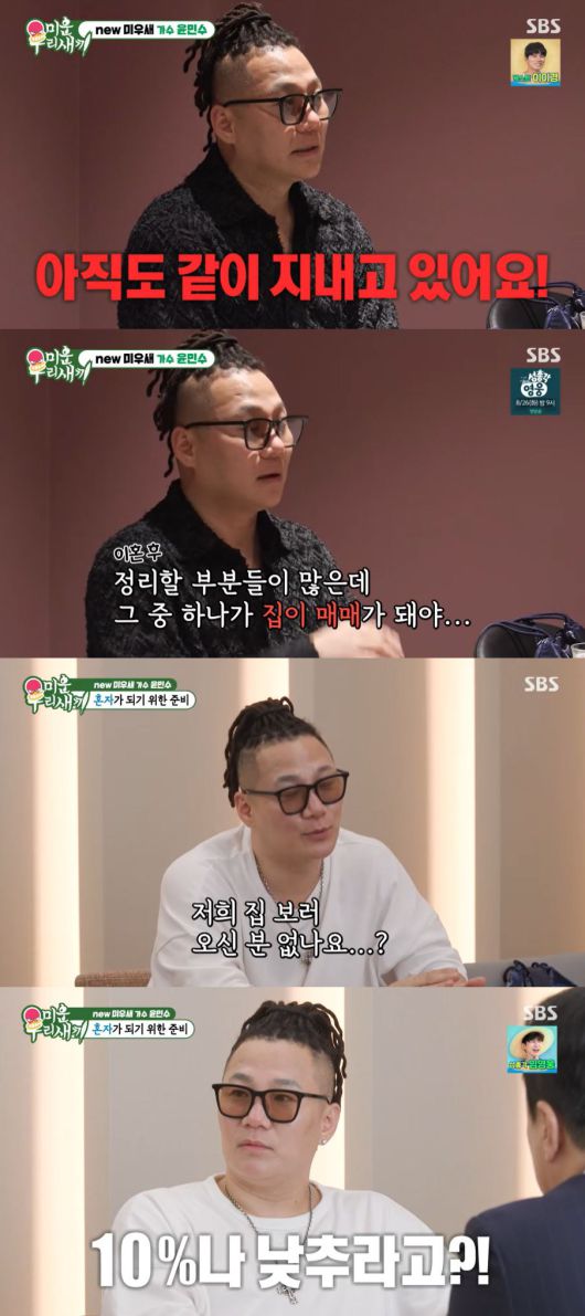 방송에서 윤민수는 지난해 이혼 소식을 전하긴 했으나 서류상 이혼은 2개월 전 확정됐다고 밝혔다. 더불어 "아직도 같이 지내고 있다. 정리할 부분이 많은데 그 중 하나가 집이 매매가 돼야 따로 헤어졌을 때도 정리가 되는 부분이 있다. 어떻게 하다 보니까 같이 지내게 됐다"면서 집이 팔리지 않아 아직 전처와 같은 집에서 생활 중이라 설명했다.