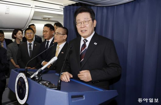 이재명 대통령이 24일 한일정상회담을 마치고 한미정상회담을 위해 일본 도쿄에서 미국 워싱턴DC로 향하는 공군1호기에서 기내 기자간담회를 하고 있다. 2025.8.24 대통령실사진기자단/송은석 기자 silverstone@donga.com |