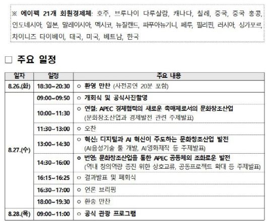 [이데일리 김미경 기자] ‘아시아태평양경제협력체’(APEC·에이펙) 정상회의 최초로 문화산업 분야 의제를 논의하는 고위급대화가 오는 26일부터 28일까지 사흘간 경북 경주에서 열린다.