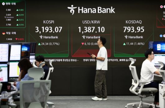(서울=뉴스1) 김민지 기자 = 25일 오전 서울 중구 하나은행 딜링룸 전광판에 코스피 지수가 표시돼 있다. 이날 코스피는 전 거래일(3168.73)보다 26.41포인트(0.83%) 오른 3195.14, 코스닥 지수는 전 거래일(782.51)보다 9.15포인트(1.17%) 상승한 791.66, 원·달러 환율은 전 거래일 주간거래 종가(1393.2원)보다 8.2원 내린 1385.0원에 출발했다. 2025.8.25/뉴스1 Copyright (C) 뉴스1. All rights reserved. 무단 전재 및 재배포, AI학습 이용 금지. /사진=(서울=뉴스1) 김민지 기자 |
