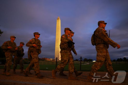 21일(현지시간) 미국 워싱턴DC에 투입된 주 방위군이 도널드 트럼프 미국 대통령의 명령에 따라 도시 범죄 예방을 지원하기 위해 워싱턴 기념탑 주변을 순찰하고 있다. 2025.08.22. ⓒ 로이터=뉴스1 ⓒ News1 류정민 특파원 |