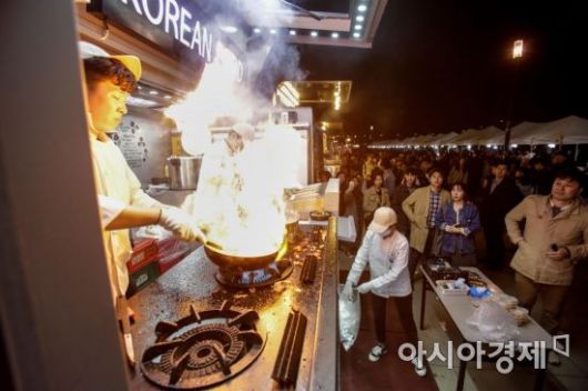 서울 여의도 한강공원에서 열린 밤도깨비야시장을 찾은 시민들이 푸드트럭 음식을 구매하기 위해 줄을 서며 조리과정을 지켜보고 있다./강진형 기자aymsdream@ |