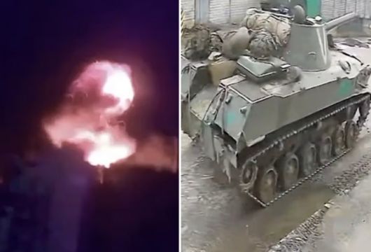 왼쪽은 지난 23일(현지시간) 우크라이나군이 러시아 점령지인 루한스크 칼리노베를 공습하면서 발생한 폭발. 공습 과정에서 ‘부차 도살자’ 3명이 사망했다. 오른쪽은 개전 초기인 2022년 3월 키이우 외곽 도시인 부차로 진입한 러시아 군인들의 모습 |