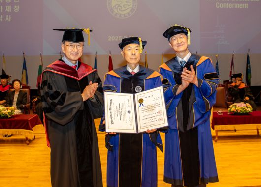 이용환 하이테크섬유 회장(가운데)이 영남대로부터 명예공학박사를 수여받았다. |