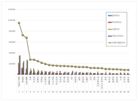 2위, 임영웅 브랜드는 참여지수 1,209,112 미디어지수 1,331,474 소통지수 2,224,077 커뮤니티지수 2,546,927이 되면서 브랜드평판지수 7,311,589로 분석됐다. 지난 7월 브랜드평판지수 5,804,110과 비교해보면 25.97% 상승했다.
