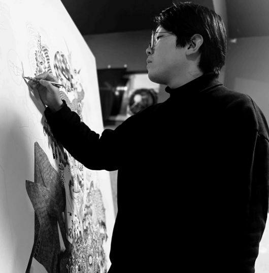 작가의 화면은 날카로운 샤프 드로잉으로 구축된다. 그는 색채를 배제한 채 흑연의 농담과 질감을 통해 관계 속 변주를 기록하며, 관객을 하나의 '플레이어로 작품 속에 초대한다.