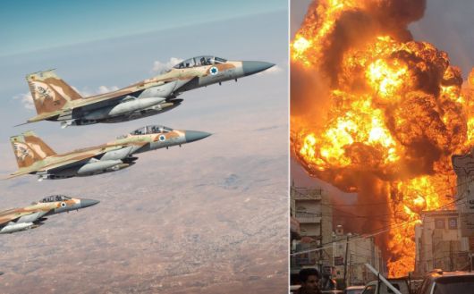 이스라엘 공군 전투기 편대(왼쪽)와 예멘 수도 사나 에너지 시설 폭발 장면. 출처=이스라엘 공군·아마드 살만 엑스 |
