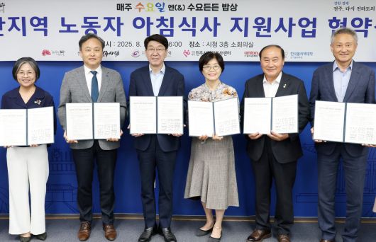 전북 전주시는 산업단지 새벽 출근 노동자들의 결식 해소와 건강 증진을 위해 민·관·기업이 함께하는 ‘아침 식사 지원사업’을 추진한다. 전주시가 참여 기관, 단체 등과 산단지역 노동자 아침 식사 지원사업 협약식을 하고 있다. 전주시 제공 |