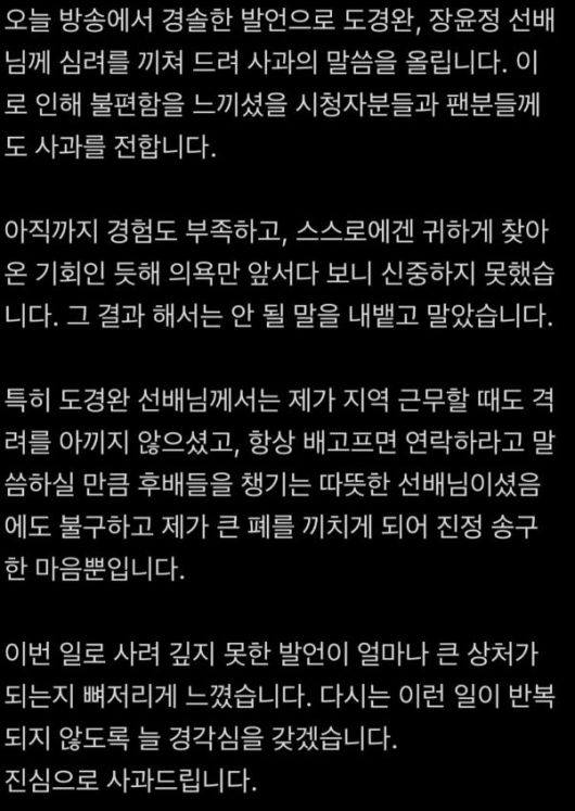 이어 "30대 후반이라는 나이와 아나운서라는 전문직의 무게에도 불구하고, 스스로에게 귀하게 찾아온 기회를 놓치고 싶지 않았다는 핑계로 경험 부족을 언급하며 마치 10대 후반 고등학생과 같은 발언을 했다는 점은 더욱 충격적이다. 아나운서로서 기본적인 언행 관리조차 하지 못한 것은 변명의 여지가 없다"라고 했다.