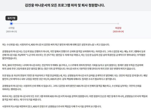 그러면서 "공영방송의 아나운서는 시청자의 신뢰 위에 서 있다. 그러나 김진웅의 발언은 KBS 아나운서 전체의 품격을 훼손하고, 수신료를 납부하는 국민의 신뢰를 저버리는 행위다"라며 "김진웅 아나운서의 모든 프로그램 하차와 KBS 아나운서직 퇴사를 강력히 청원한다. 이번 청원이 단순한 개인 징계가 아니라, 공영방송으로서의 책임과 품격을 바로 세우는 계기가 되기를 바란다"라고 요구했다.