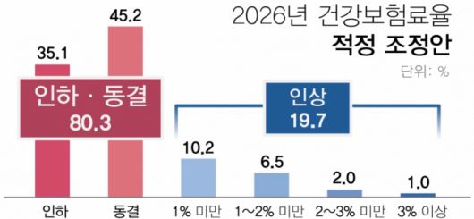 25일 한국경영자총협회가 발표한 '2025 국민건강보험 현안 대국민 인식조사'에 따르면 2026년도 보험료율 결정과 관련해 응답자의 80.3%는 '인하 또는 동결해야 한다'고 밝혔다. 보험료율을 '인상'해야 한다는 응답은 19.7%였다.