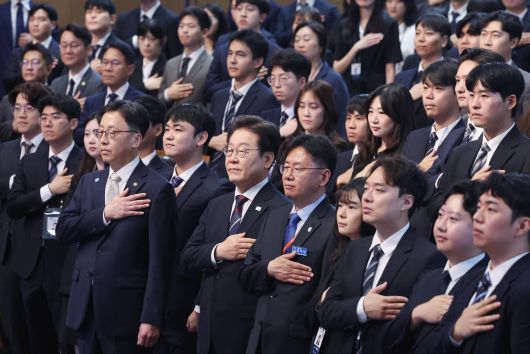 이재명 대통령이 7월 14일 충북 진천 국가공무원인재개발원에서 5급 신임관리자과정 교육생에게 특강에 앞서 참석자들과 국민의례를 하고 있다. (대통령실통신사진기자단) 2025.07.14 뉴시스 |