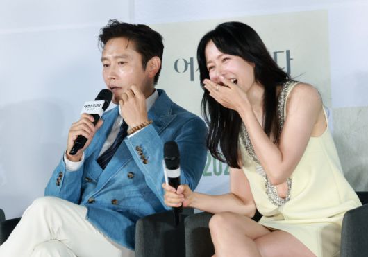 배우 이병헌(왼쪽)이 19일 오전 서울 용산구 CGV용산아이파크몰에서 열린 영화 ‘여쩔수가없다’ 제작보고회(감독 박찬욱)에 참석해 손예진과의 호흡에 대해 이야기 하고 있다.(사진=뉴스1) |
