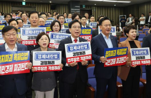 국민의힘은 25일 5개 쟁점 법안이 여당 주도로 모두 국회 본회의를 통과하며 '필리버스터 정국'이 막을 내린 데 대해 "입법 독주를 좌시하지 않겠다"고 날을 세웠다. 특히 전날과 이날에 걸쳐 노란봉투법(노동조합 및 노동관계조정법 2·3조 개정안)과 2차 상법 개정안이 본회의 문턱을 넘은 걸 두고 "경제내란법 강행처리"라며 거세게 반발했다.