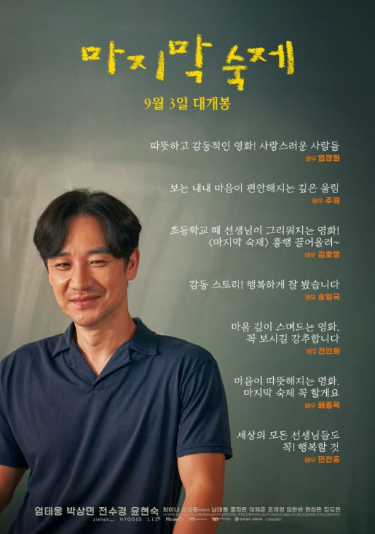 오는 9월 3일 개봉 예정인 영화 ‘마지막 숙제가 셀럽 리뷰 포스터를 공개하고, 영화의 개봉을 기다리는 관객들의 마음을 따뜻한 행복으로 채워줄 다양한 이벤트를 마련했다. 영화 ‘마지막 숙제’는 임시 담임이 된 선생님과 각자의 색깔로 마지막 숙제를 이뤄 나가는 아이들의 이야기다.