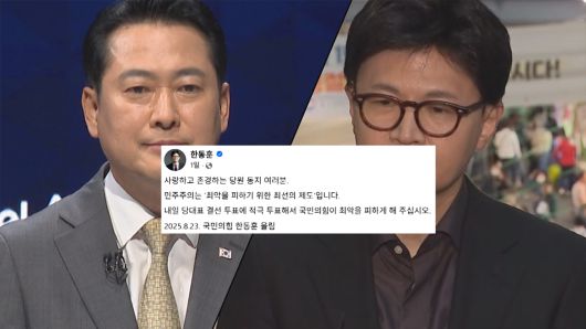 국민의힘 당 대표 선거가 김문수·장동혁 후보 간 결선 투표로 이어진 가운데 한동훈 전 국민의힘 대표가 입장을 밝혔습니다.