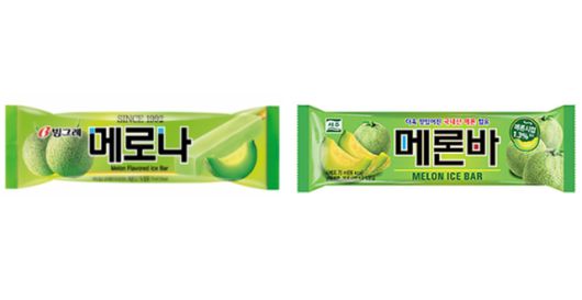 빙그레의 '메로나'(왼쪽 사진)와 서주의 '메론바'. 빙그레·서주 홈페이지 캡처 |