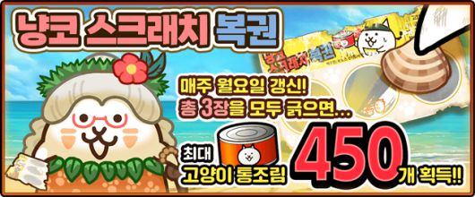 매주 고양이 통조림을 획득할 수 있는 ‘냥코 스크래치 복권’이 등장한다. 총 3장을 모두 긁으면 최대 고양이 통조림 450개를 획득 가능하다.