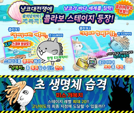 콜라보 한정 캐릭터 ‘냥복치’를 획득 가능한 ‘살아남아라 개복치’, 스코어에 따른 보수를 획득 가능한 ‘3억마리 형제들의 죽음’, 클리어할 수록 적이 강해지는 ‘미스 개복치 강습!’이 등장한다.