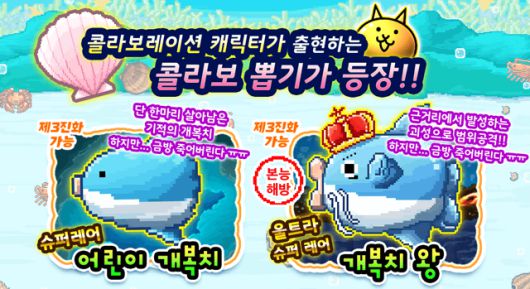 콜라보 한정 캐릭터가 출현하는 ‘살아남아라! 개복치!’ 콜라보 뽑기도 개최된다. 울트라 슈퍼 레어 캐릭터 ‘개복치 왕’은 본능 해방이 가능하다.