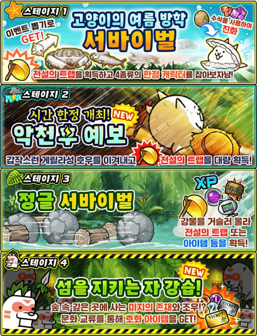 게릴라적으로 개최되는 시간 한정 스테이지 ‘악천후 예보’가 새롭게 등장하며, ‘고양이의 여름 방학 서바이벌’ 스테이지와 함께, 클리어 시 한정 이벤트 뽑기를 돌릴 수 있는 ‘전설의 트랩’을 획득할 수 있다.