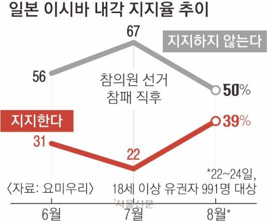 지난달 참의원(상원) 선거 패배로 곤두박질쳤던 이시바 시게루 일본 내각 지지율이 한 달 만에 두자릿수 이상 뛰며 30% 후반대를 회복했다. 다만 이런 반등세에도 집권 자민당 내 불신임 공세와 야당의 비협조로 인한 내각 해산 가능성이 거론되며 일본 정국은 여전히 안갯속이다.