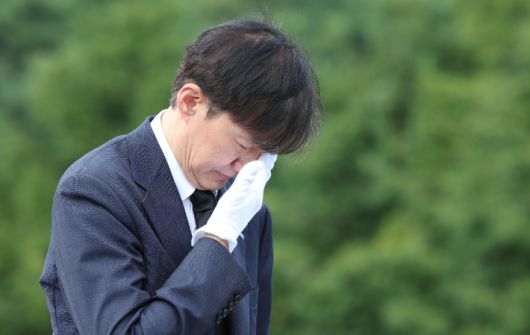 조국혁신당 조국 혁신정책연구원장이 25일 오전 경남 김해시 진영읍 봉하마을 노무현 전 대통령 묘역을 참배하며 눈물을 닦고 있다. 연합뉴스 |