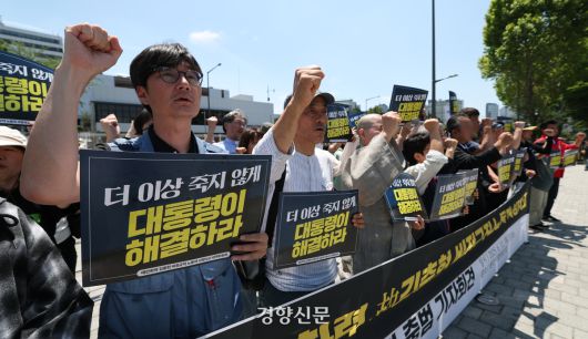 ‘태안화력 고 김충현 비정규직 노동자 사망사고 대책위원회’가 지난 6월12일 서울 용산구 대통령실 앞에서 대책위 출범 기자회견을 하고 있다. 권도현 기자 |