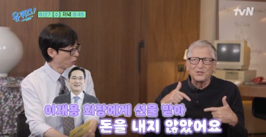 tvN 예능 프로그램 ‘유 퀴즈 온 더 블럭’ 제작진은 25일 공식 계정을 통해 오는 27일 방송 예정인 빌 게이츠 특별 출연분 예고 영상을 공개했다. 영상 속에서 게이츠는 MC 유재석, 조세호와 자리해 특유의 유머 감각과 함께 철학적인 답변을 이어갔다.