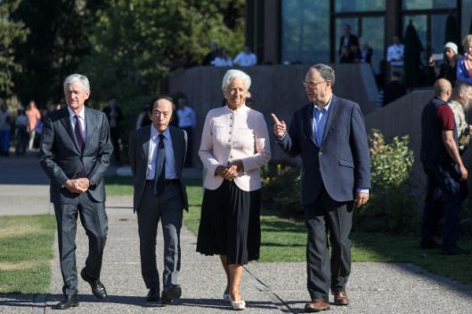 제롬 파월 미국 연방준비제도(Fed·연준·왼쪽부터)·우에다 가즈오(植田和男) 일본은행 총재·크리스틴 라가르드 유럽중앙은행(ECB) 총재·앤드루 베일리 영란은행(BOE) 총재가 22일(현지시간) 미국 와이오밍주 잭슨홀에서 열린 캔자스시티 연방준비은행의 2025년 잭슨홀 경제 정책 심포지엄, '변화하는 노동시장: 인구 구조·생산성 그리고 거시경제 정책'에 참석하기 위해 걸어가고 있다./로이터·연합 |