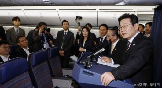 [워싱턴=뉴시스] 고범준 기자 = 이재명 대통령이 24일(현지 시간) 한일정상회담을 마치고 일본 도쿄에서 미국 워싱턴DC로 향하는 공군1호기에서 기내 기자간담회를 하고 있다. 2025.08.25. bjko@newsis.com /사진= |
