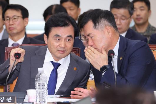 안규백(왼쪽) 국방부 장관과 석종건 방위사업청장이 25일 국회 국방위원회 전체회의에서 대화를 나누고 있다. [연합] |