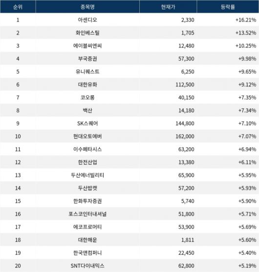 6위 대한유화(006650)는 종가 112,500원으로 9.12% 상승 마감했다. 7위 코오롱(002020)은 종가 40,150원으로 7.35% 상승 마감했다. 8위 백산(035150)은 종가 14,180원으로 7.34% 상승 마감했다. 9위 SK스퀘어(402340)는 종가 144,800원으로 7.10% 상승 마감했다. 10위 현대오토에버(307950)는 종가 162,000원으로 7.07% 상승 마감했다.