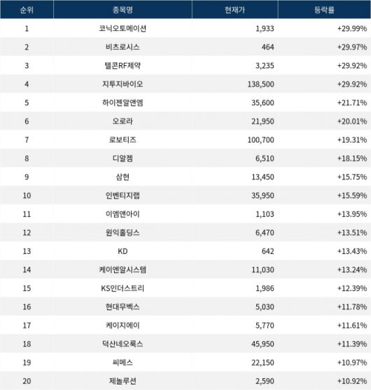 6위 오로라(039830)는 종가 21,950원으로 20.01% 상승 마감했다. 7위 로보티즈(108490)는 종가 100,700원으로 19.31% 상승 마감했다. 8위 디알젬(263690)은 종가 6,510원으로 18.15% 상승 마감했다. 9위 삼현(437730)은 종가 13,450원으로 15.75% 상승 마감했다. 10위 인벤티지랩(389470)은 종가 35,950원으로 15.59% 상승 마감했다.