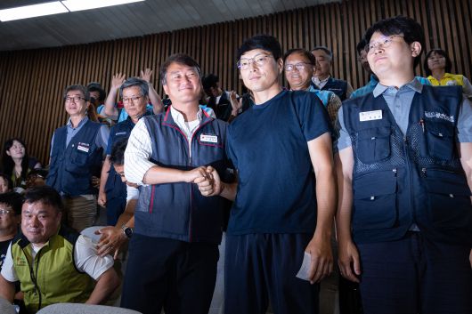 양경수(앞줄 오른쪽 세번째) 민주노총 위원장이 지난 24일 서울 여의도 국회에서 열린 제428회 국회(임시회) 제2차 본회의에서 전국금속노조 유최안 거제통영고성 조선하청지회 조합원의 손을 잡고 노동조합 및 노동관계조정법 일부개정법률안(대안) 가결을 지켜보고 있다. /뉴스1 |