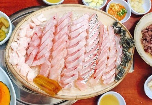 이곳에서 민어회를 주문하면 기본 반찬으로 민어전, 간장새우, 가자미식해, 묵은지, 호박전 등이 차려져 그것만으로도 푸짐한 한상을 자랑한다. 여기에 민어회가 접시에 정성스레 담겨 나오면 민어회 한상이 완성된다. 부드러운 부위부터 쫄깃한 지느러미, 고소한 뱃살까지 각 부위가 골고루 포함돼 다양한 식감과 맛을 한 번에 즐길 수 있다. 탱탱하면서도 쫄깃한 식감이 돋보이는 부레와 부드럽게 조리한 민어 껍질도 여름 보양식 민어회의 매력에 푹 빠지게 한다.