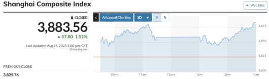 상하이와 선전 증권거래소 상위 300개 종목으로 구성된 CSI 300 지수는 전 거래일 대비 91.22포인트(2.08%) 상승하며 4469.22에 마감했다. 상하이종합지수는 전날 대비 57.80포인트(1.51%) 올라 3883.56에 보합 마감했다.