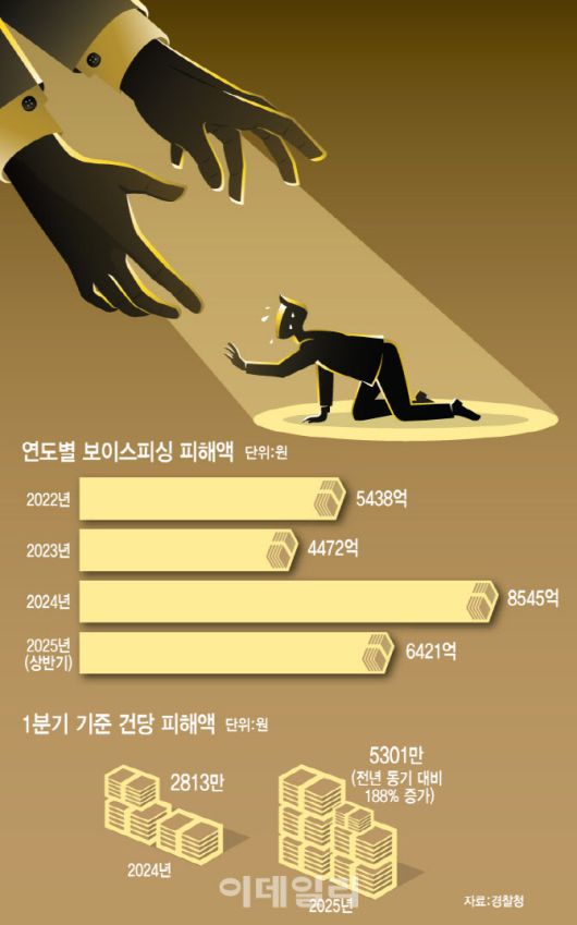보이스피싱 범죄가 올해 연 피해액이 처음으로 1조원을 넘을 것으로 예상하면서 정부와 금융권의 보이스피싱 방지책도 속도를 내고 있다. 갈수록 조직화·고도화되면서 올 상반기 보이스피싱 피해 액수도 6421억원에 이른다. 이 추세라면 최고치였던 작년 피해액(8545억원)을 넘어 보이스피싱 피해액 ‘1조’ 시대가 현실이 할 가능성이 크다. 제1금융권보다 방비가 취약한 제2금융권 피해도 커지고 있다.