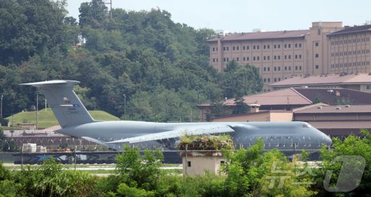 이재명 대통령과 도널드 트럼프 미국 대통령의 한미 정상회담이 하루 앞으로 다가온 가운데 이번 정상회담에서는 '방위비 청구서'로 불리는 트럼프 대통령의 안보비용 분담 요구가 거셀 것으로 예상된다. 사진은 25일 경기 평택시 주한미군 오산공군기지에 C-5 수송기가 계류되어 있는 모습. 2025.8.25/뉴스1 ⓒ News1 김영운 기자 |