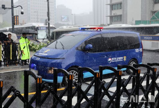 [서울=뉴시스] 김진아 기자 = '건진법사' 전성배 씨를 태운 호송차가 25일 김 여사 관련 의혹들을 수사하는 민중기 특별검사팀 사무실이 마련된 서울 종로구 KT광화문 West빌딩으로 들어가고 있다. 2025.08.25. bluesoda@newsis.com |