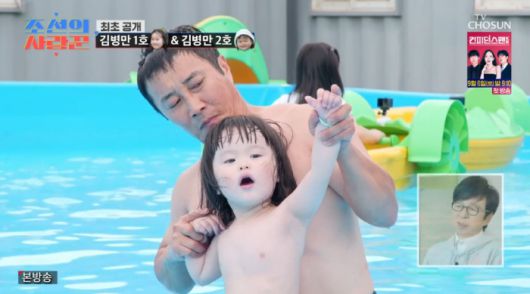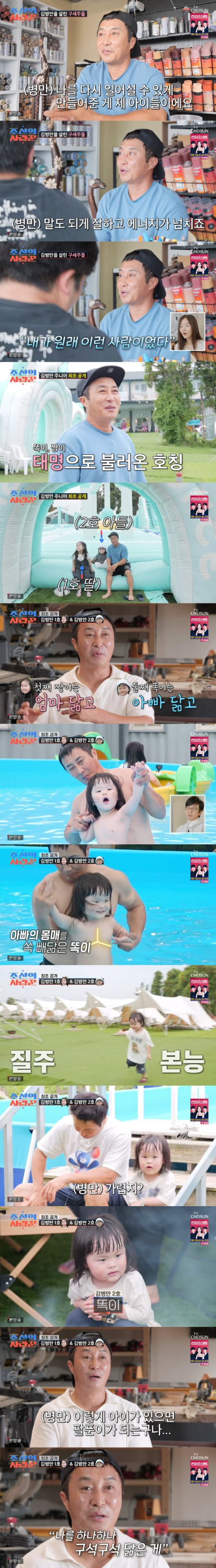김병만은 "짱이는 엄마, 똑이는 아빠 닮았다. 완전 군살이 없는 갈라진 근육 있지 않나. 똑이는 앞가슴에 근육 형태가 잡혀 있다"면서 "간호사가 '아기가 무슨 알통을 갖고 태어나냐'하더라"며 웃었다.