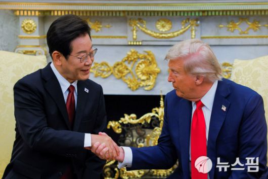 [워싱턴 로이터=뉴스핌]김근철 기자=이재명 대통령과 도널드 트럼프 미국 대통령이 25일(현지시간) 백악관에서 정상회담을 시작하면서 악수하고 있다. 2025.08.26 kckim100@newspim.com |